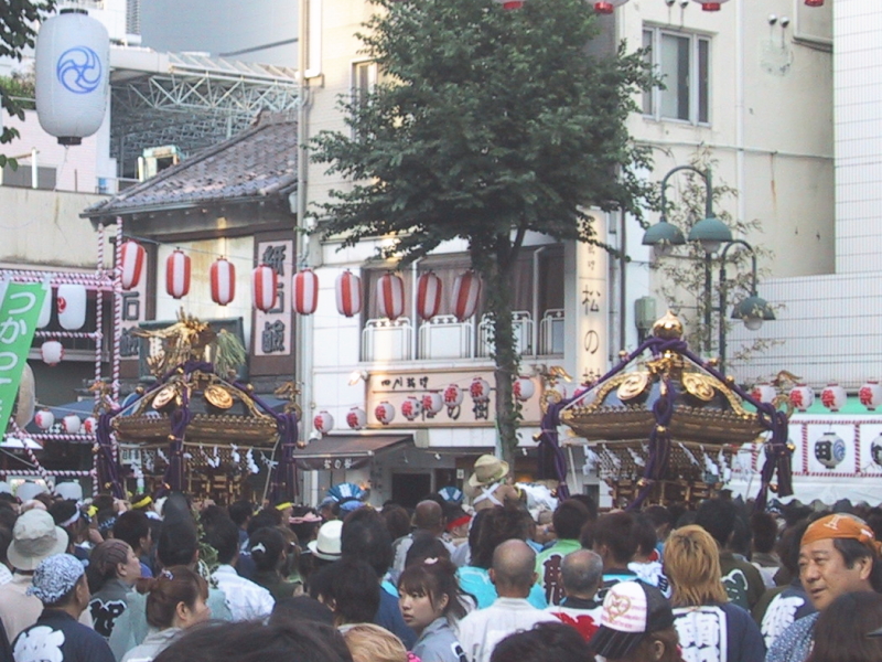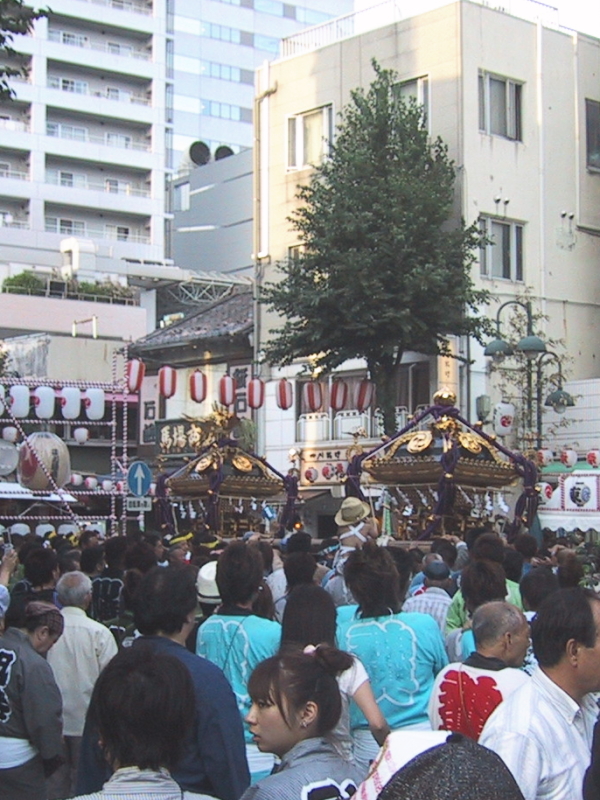 | 商店街中央の三角広場に二基の神輿が揃いました 二基同時に差して休憩です |