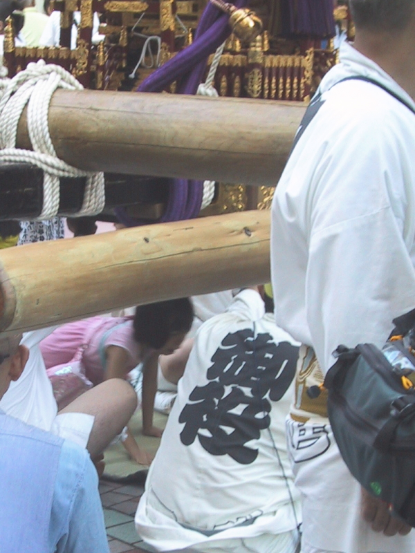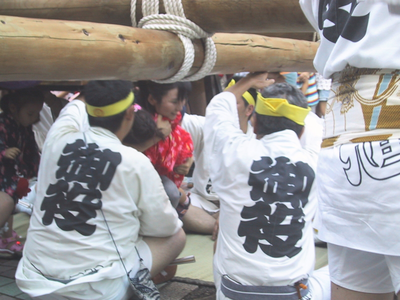 休憩の間、神輿くぐりが行われます この後、二基の神輿は駅周辺を巡行し8時に宮入し社殿に据えられます |