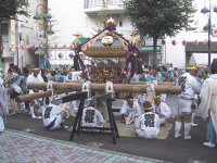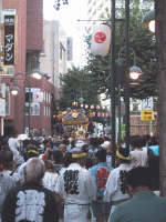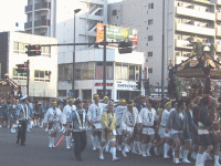 貝塚通りを巡行中の「玉」神輿 |